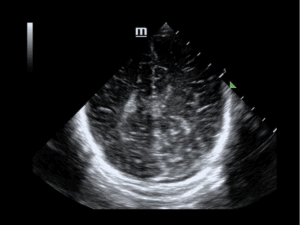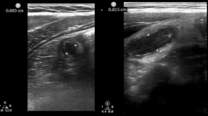 A 13-year-old female presented with hours of periumbilical pain without fever vomiting or diarrhea; VAS was 2. Examination showed bilateral lower quadrant tenderness without peritoneal signs. Complete blood count (CBC) was normal, and C-reactive protein (CRP) was 4.6 mg/dL. POCUS found an enlarged non-compressible appendix that appeared thick-walled and was surrounded by inflamed fat (Figure 3). Radiology-performed ultrasound (RADUS) found a 7.5 millimeter noncompressible tubular structure in the right lower quadrant consistent with appendicitis. She was admitted to surgery for observation. She was discharged the following morning with a nontender abdomen.