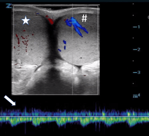 Figure 3. Doppler gate is placed over a blood vessel and shows a tardus parvus pattern.