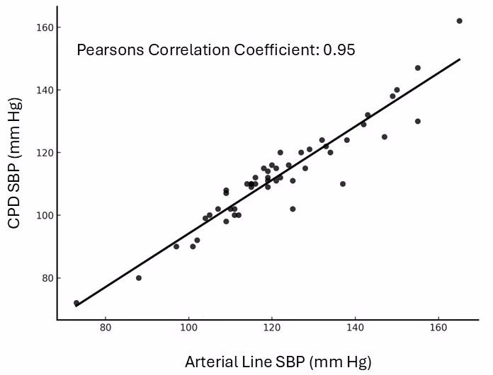 Adequate blood pressure is a key outcome variable of successful resuscitation. In some circumstances, accurately measuring systolic blood pressure (SBP) in a patient who is critically ill can be challenging. This difficulty may arise during rapid response situations due to high ambient noise environments interfering with auscultation, patient-related factors affecting non-invasive blood pressure determination, or the initial absence of intraarterial blood pressure monitoring [1,2]. Here we report on the correlation of SBP determined using point of care ultrasound (POCUS) with color power Doppler (CPD) compared to SBP measured with an indwelling intraarterial catheter. This method may have utility in circumstances when other methods of measurement may be inaccurate pending insertion of an intraarterial catheter.