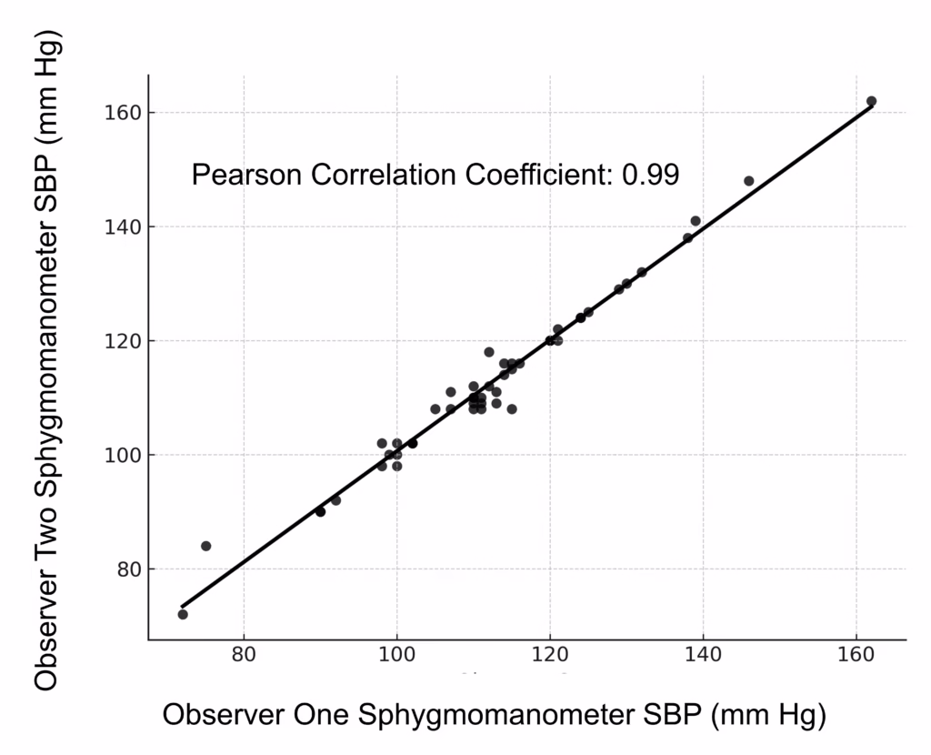 A total of 50 subjects were enrolled in the study. Demographics, disease characteristics, and vasopressor dose at the time of the measurements are presented in Table 1. The intraarterial SBP and the CPD SBP measurements are compared in Figure 1 with Pearson’s coefficient correlation of 0.95. A Bland-Altman analysis of the data is presented in Figure 2 with mean difference (bias) of -9.0 mm Hg and standard deviation of differences of 5.7 mm Hg. Four pairs of values were outside of the limits of agreement; in both, the arterial pressure was higher than the POCUS with CPD measurement. The interobserver variability of the sphygmomanometer measurements between the two blinded observers are presented in Figure 3 with a Pearson’s coefficient correlation of 0.99—indicating that interobserver variability of the sphygmomanometer value was minimal.