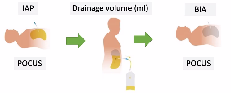 Each patient was scheduled for evaluation in the morning with the night dwell still in place. Initially, volume overload was assessed using POCUS (protocol detailed below). Following this, IAP was measured, and the PD fluid was drained. After drainage, a second POCUS examination and a bioimpedance analysis (BIA) were performed. A schematic representation of the study protocol is provided in Figure 1.