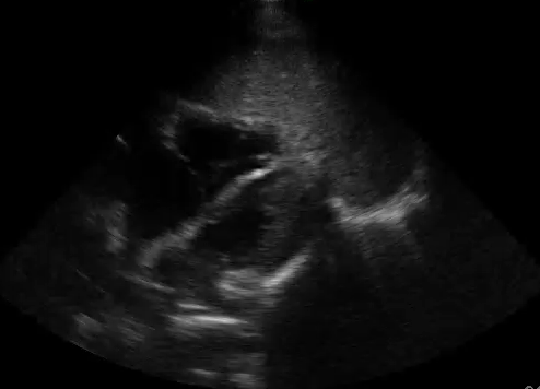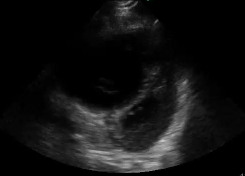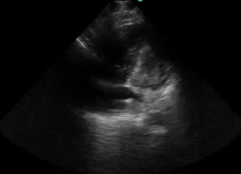 Image Interpretation: Pericardial effusion was absent yet the right ventricle (RV) was dilated acutely as the RV wall thickness was normal (subcostal).  The systolic D-septum (parasternal) suggested an elevated RV afterload.  Along with the hyperdynamic left ventricle (LV) and normal left atrium (LA), there was likely a flow obstruction between the RV to LA which maybe related to the “lesion” in the RV.