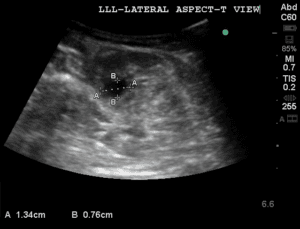 Figure 1. (A) A distended left Common Femoral Vein seen on point-of-care ultrasound (POCUS). (B) The same vein proves to be non-compressible when pressure was applied.
