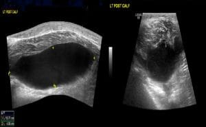 Figure 2. 1.6×1.1cm non-compressible, non-pulsatile hypoechoic area with irregular borders within left lateral gastrocnemius muscle confirming presence of fluid.